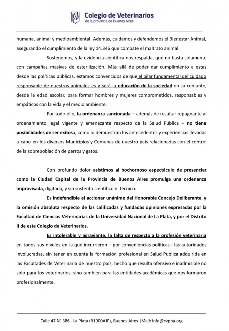 Señalan que "Es indefendible el accionar del Concejo, y la omisión absoluta de los aportes realizados por la Facultad de Ciencias Veterinarias de la Universidad Nacional de La Plata, y por el Distrito II de este Colegio de Veterinarios". "Es intolerable y agraviante, la falta de respeto a la profesión veterinaria".