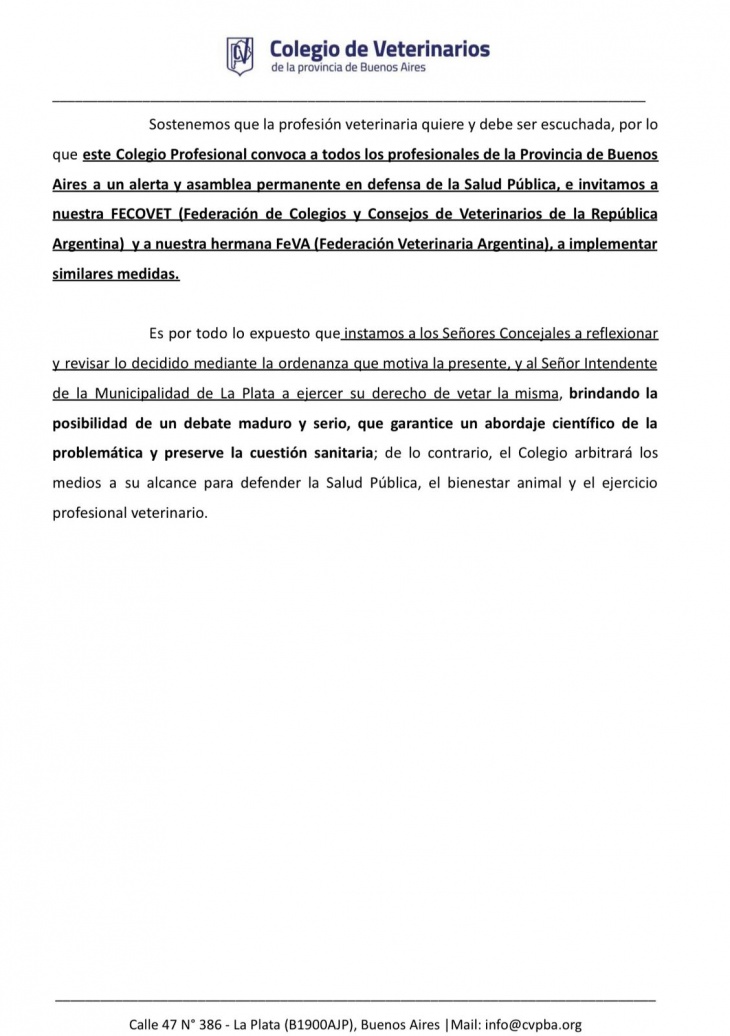 Desde el CVPBA piden a los Señores Concejales que reflexionen y revisen lo decidido, al Señor Intendente de la Municipalidad de La Plata a ejercer su derecho de vetar la misma, brindando la posibilidad de un debate maduro y serio, que garantice un abordaje científico de la problemática y preserve la cuestión sanitaria; de lo contrario, el Colegio de Veterinarios de la Provincia de Buenos Aires arbitrará los medios a su alcance para defender la Salud Pública, el bienestar animal y el ejercicio profesional veterinario.