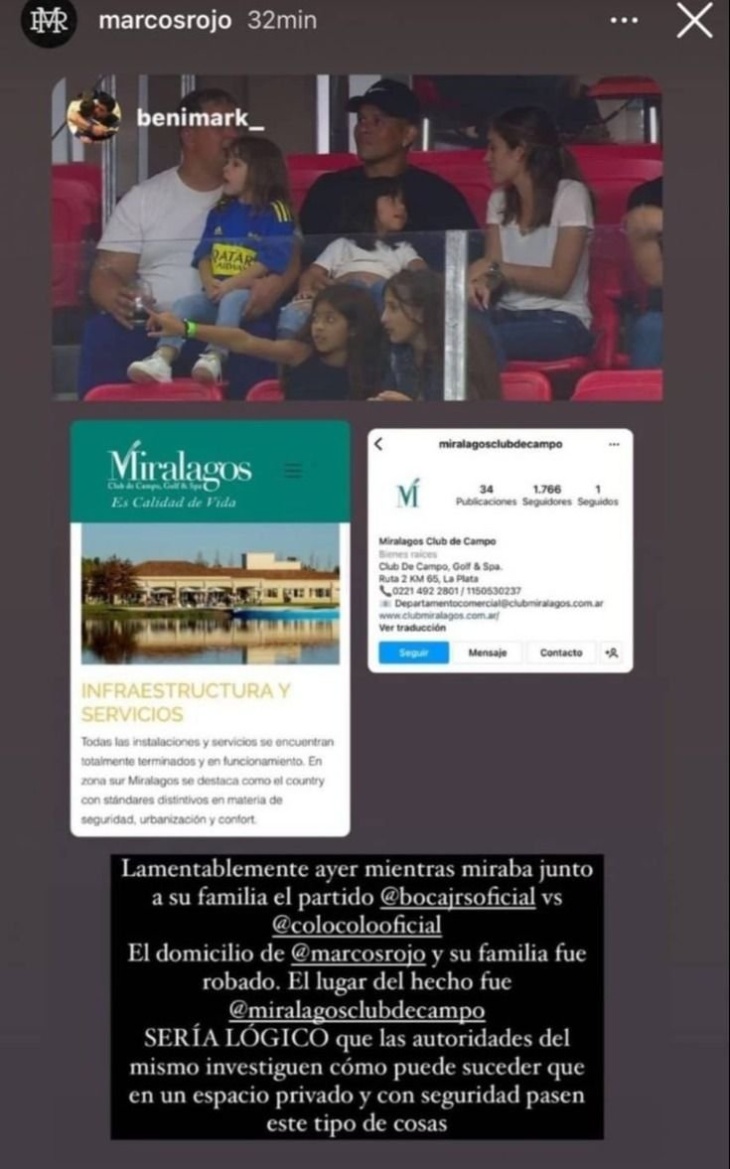 “Lamentablemente, ayer mientras miraba junto a su familia el partido Boca vs. Colo Colo, el domicilio de Marcos Rojo y su familia fue robado. El lugar del hecho fue Miralagos Club de Campo. Sería lógico que las autoridades del mismo investiguen cómo puede suceder que en un espacio privado y con seguridad pasen este tipo de cosas”, expresaba el texto.