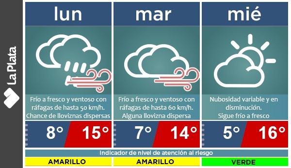 Según precisó la Dirección de Hidrometeorología local, "lunes y martes serán días fríos a frescos con tiempo ventoso y ráfagas que puedan rondar de 50 a 60 KM/H, y chances de precipitaciones débiles".