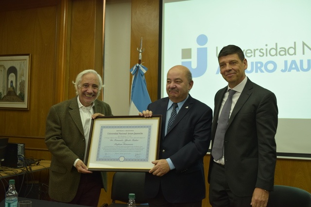El acto sirvió además de escenario para la entrega del título oficial de “Profesor honorario de la Universidad Nacional Arturo Jauretche” al Dr Fernando Tauber. El titular de la UNLP recibió el diploma de manos del rector Emérito de la UNAJ, Ernesto Villanueva. También participó el Secretario de Investigación y Vinculación Tecnológica Patricio Narodowski.