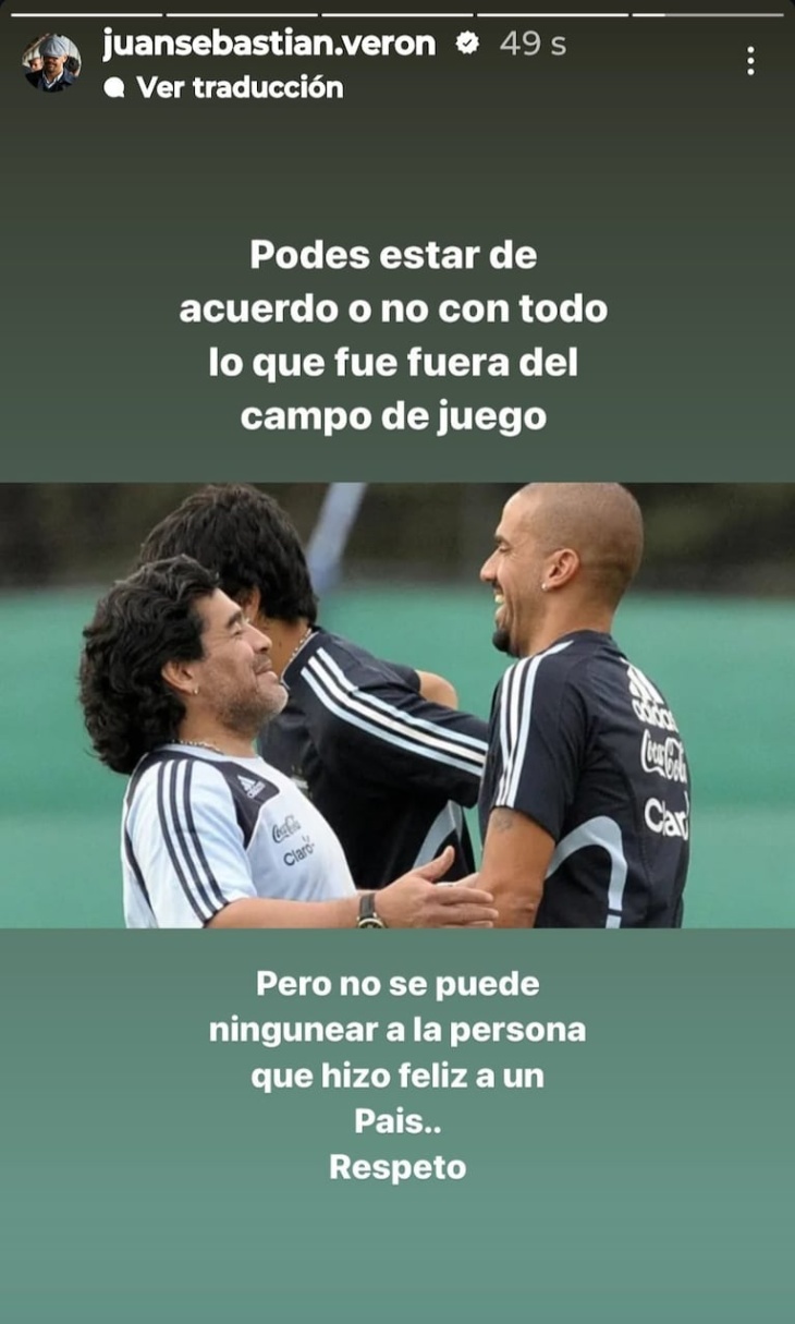 “Podes estar de acuerdo o no con todo lo que fue afuera del campo. Pero no se puede ningunear a la persona que hizo feliz a un país. Respeto”, expresó y Juan Sebastián Verón en su cuenta oficial de Instagram.