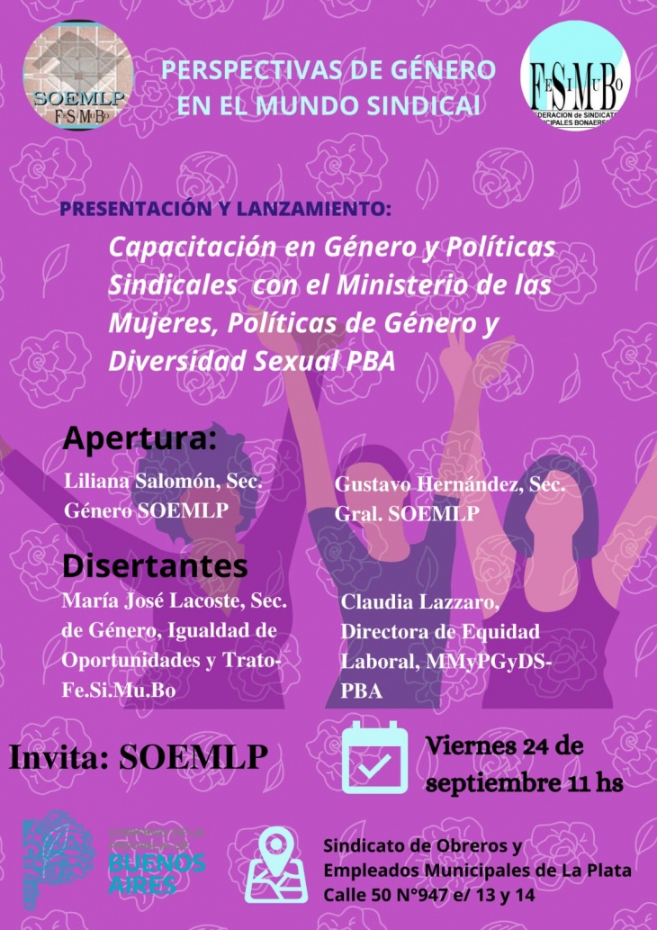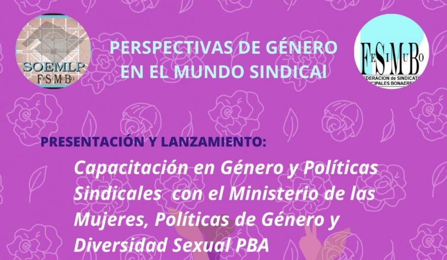 Desde el Sindicato de Obreros y Empleados Municipales de La Plata, en el marco de lo que han denominado Programa de Políticas de Género en el mundo Sindical junto a la Federación de Sindicatos Municipales Bonaerenses se llevará a cabo la presentación y el lanzamiento de la Capacitación en Género y Políticas Sindicales con el Ministerio de las Mujeres, Políticas de Género y Diversidad Sexual de la provincia de Buenos Aires.