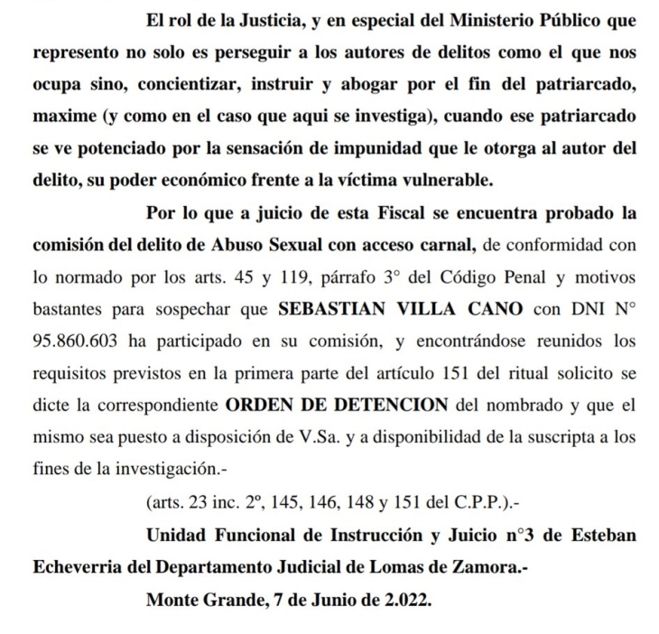 En las últimas horas de ese martes trascendió la noticia de que la fiscal de Esteban Echeverría, Vanesa González, pidió la captura y detención del futbolista de Boca Juniors, Sebastián Villa, en el marco de una causa judicial donde se lo investiga por presunto abuso sexual.