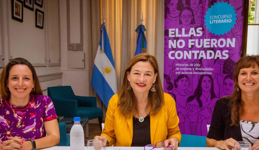 La ministra Estela Diaz junto a la directora provincial de Comunicación Lucía García Itzigsohn y la directora de Comunicación y Diseño Soraya Polonara presentaron los textos ganadores de la tercera edición del concurso literario impulsado por el Ministerio de las Mujeres, Políticas de Género y Diversidad Sexual que recibió más de 200 relatos.