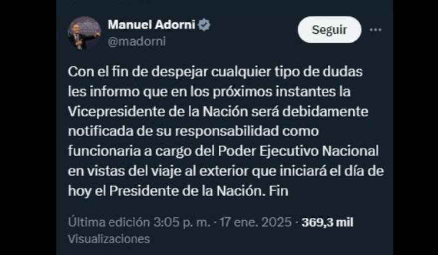 Adorni publicó en su cuenta de X: “Con el fin de despejar cualquier tipo de dudas, les informo que en los próximos instantes la Vicepresidente de la Nación será debidamente notificada de su responsabilidad como funcionaria a cargo del Poder Ejecutivo Nacional...". El comentario aludió al incidente ocurrido en diciembre, cuando Villarruel afirmó no haber sido notificada del viaje de Milei a Italia, generando una controversia sobre el vacío de poder.