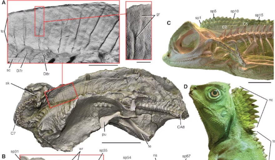 Según publicó Science, el fósil presenta partes momificadas con escamas, recubrimientos córneos y huellas de tejidos que permiten reconstruir la apariencia del animal con una precisión inédita. Entre los rasgos más llamativos se destacan una fila de escamas espinosas a lo largo de la espalda y estructuras similares a pezuñas en las patas traseras, detalles que el propio Sereno describió como “casi de dragón”.