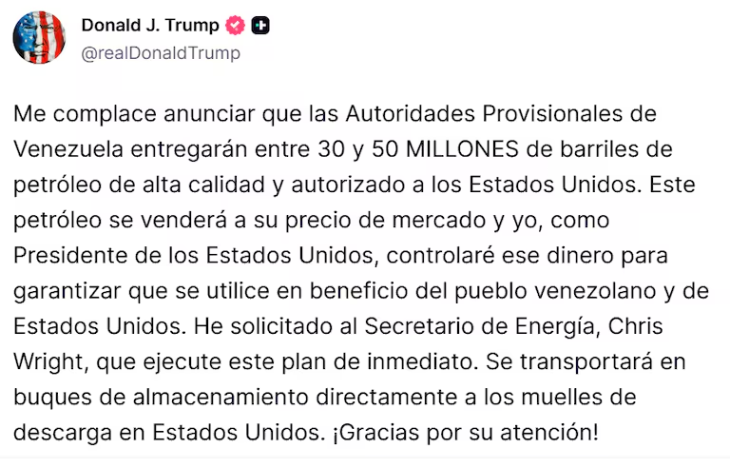 A través de un mensaje en la red social Truth Social, Trump expresó: “Me complace anunciar que las autoridades provisionales de Venezuela entregarán entre 30 y 50 millones de barriles de petróleo de alta calidad y autorizado a los Estados Unidos".
