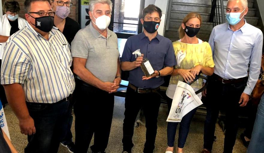 Tanto el Gobernador Axel Kicillof como el Intendente de Berisso, Fabián Cagliardi, recibieron por parte de las investigadoras Guadalupe Canosa y Paula Alfieri, un litro de spray biocida. Como se sabe es un líquido desarrollado por la Tecnológica de La Plata, que impide la reproducción virológica del Coronavirus. Esta fórmula química está siendo repartida actualmente en Hospitales públicos y laboratorios de la región.